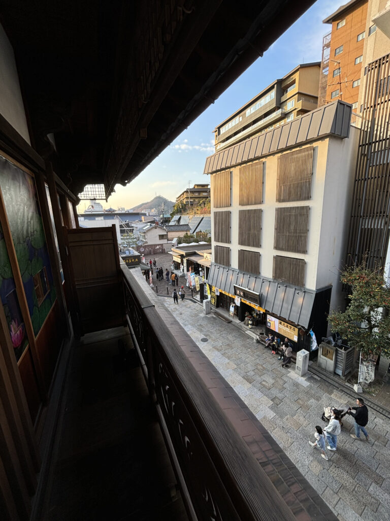 奥の扉を開けると小さなバルコニーがあり、温泉街の通りを上から眺めることができます。