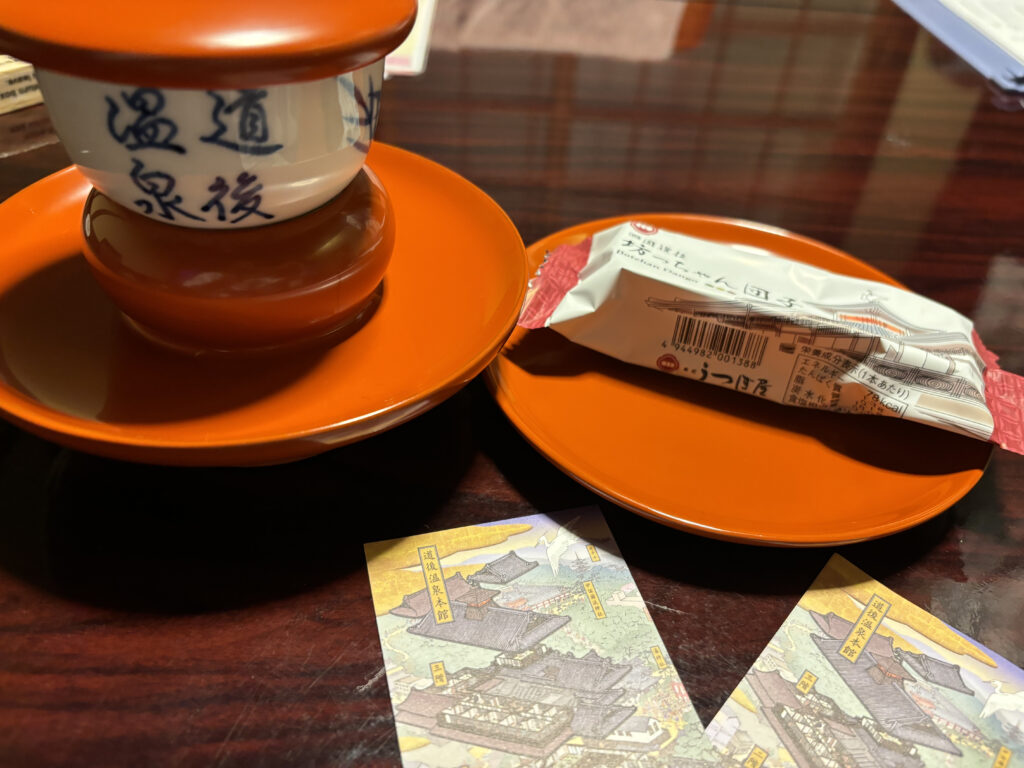お風呂から上がったらお茶とお菓子を出してもらえます。一度食べてみたかった坊ちゃん団子、個室の雰囲気も相まって特別感を感じながら美味しくいただけました!