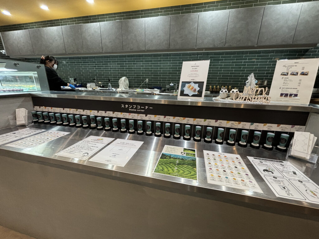 ショーケースを見て食べたい団子を決めたら、スタンプコーナーで専用シートに選んだお団子のスタンプを押し、レジに持って行って注文しお会計。受け渡し口で、完成したマイ坊っちゃん団子を受け取ります。