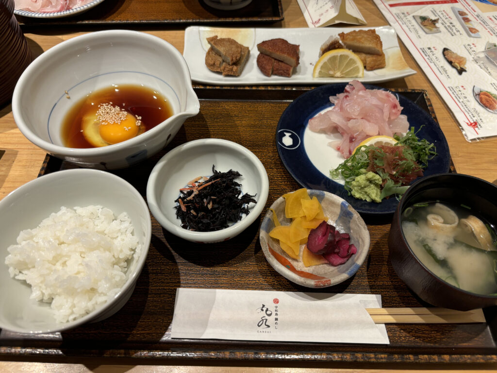 宇和島鯛めしは生の鯛のお刺身を溶き卵や薬味と混ぜて、白いごはんと一緒に食べるスタイルなので、子どもは食べられず、自宅から持参したお弁当タイプのベビーフードを食べさせました。